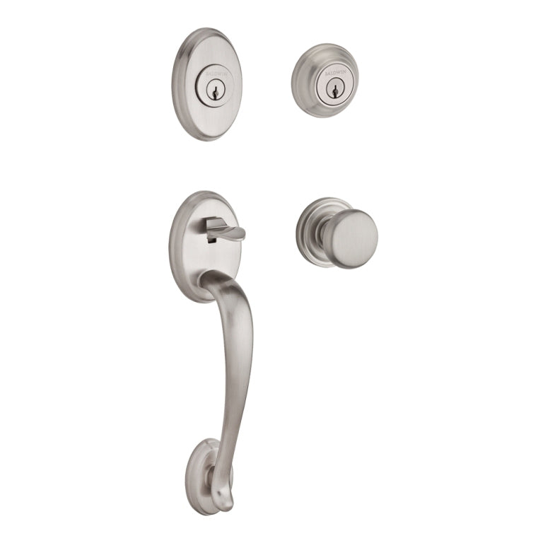 The Columbus double cylinder handleset features a non-locking latch and a locking deadbolt. The latch is retracted by a thumb piece on the outside or a knob/lever on the inside. The deadbolt is locked/unlocked by a key on the outside and a key on the inside. The Columbus handleset is also available in the single cylinder (locks/unlocks with key on exterior and thumb turn on interior) and dummy (used on the fixed door on a set of double doors) functions. These items are listed separately.