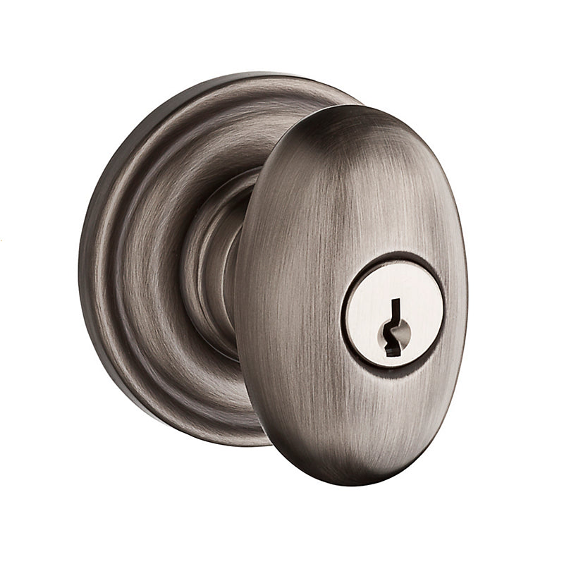The Ellipse entry knob set locks/unlocks with a key on the outside and a turnpiece on the inside. The Ellipse knob is also available in the privacy (locks/unlocks with a push-button on the interior and can be unlocked from the exterior with the emergency release), passage (contains a passage latch but no locking function), dummy (contains no latch or locking function), and half dummy (one sided with no latch or locking function) functions. These items are listed separately.