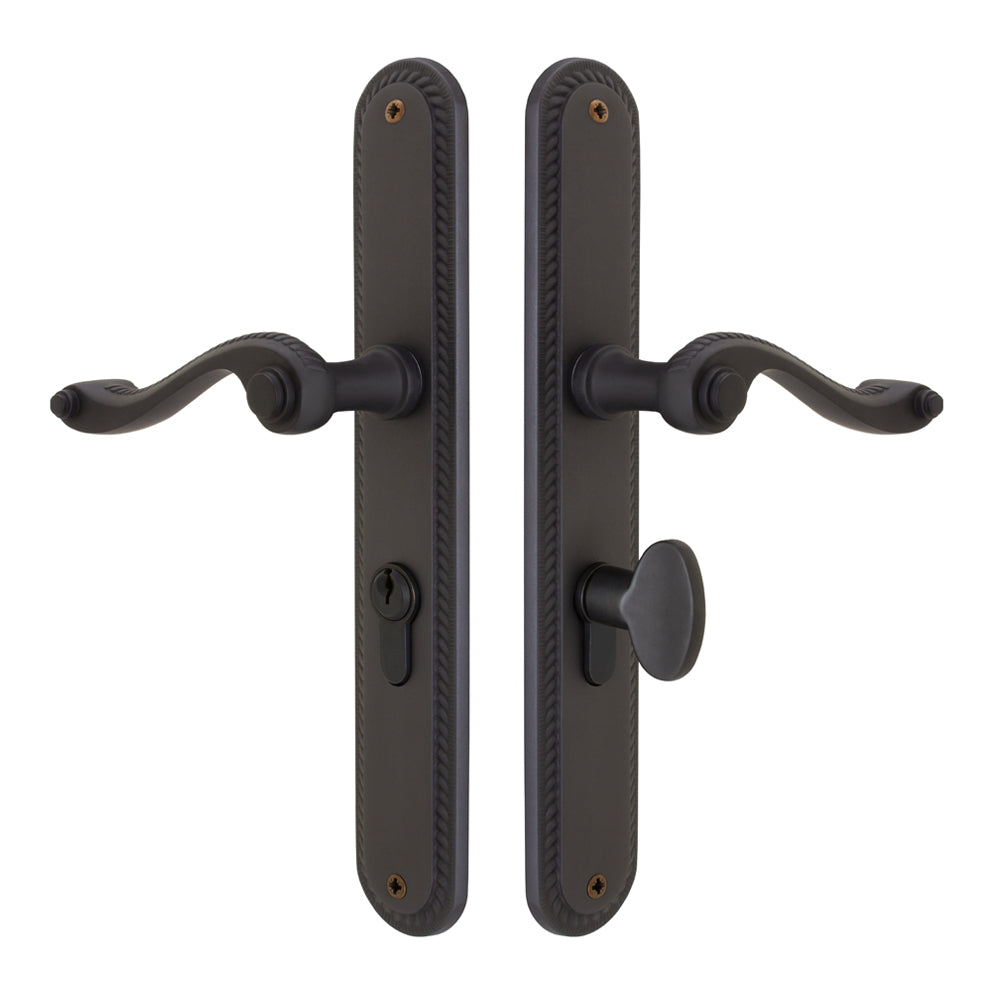 The Florentine keyed sliding door lock features a European key cylinder, thumbturn, and the 558-50 mortise mechanism. The mechanism is retracted by a key on the outside or the thumbturn on the inside. The Florentine style is also available in the patio (locks/unlocks with a thumbturn on the inside only) and dummy (used on the inactive door when two sliding doors meet in the middle) functions. These items are listed separately.