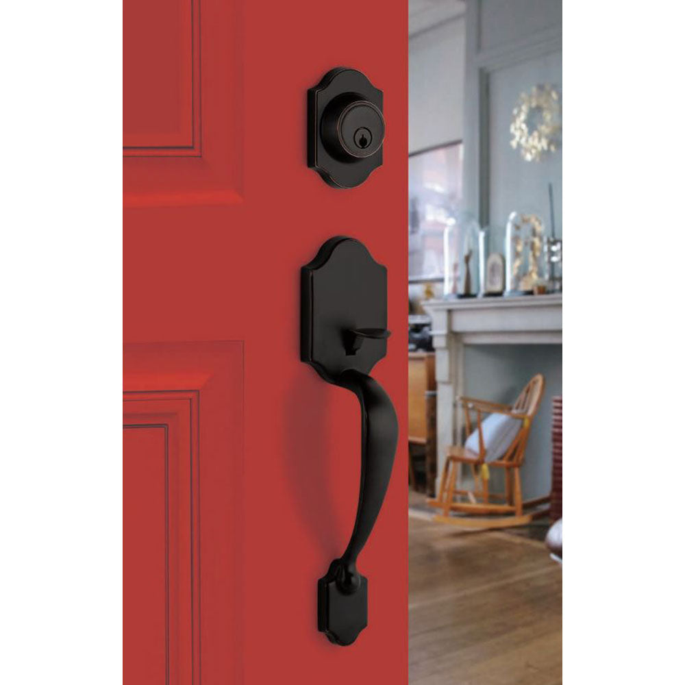 The Everly single cylinder handleset features a non-locking latch and a locking deadbolt. The latch is retracted by a thumb piece on the outside or a knob/lever on the inside. The deadbolt is locked/unlocked by a key on the outside and a thumb turn on the inside.
