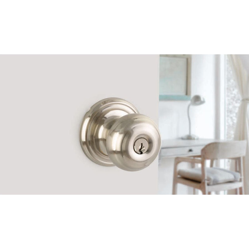 The Lewiston entry knob set locks/unlocks with a key on the outside and a turnpiece on the inside. The Lewiston knob is also available in the privacy (locks/unlocks with a turnpiece on the interior and can be unlocked from the exterior with the emergency egress), passage (contains a passage latch but no locking function), or dummy (contains no latch or locking function). These items are listed separately.